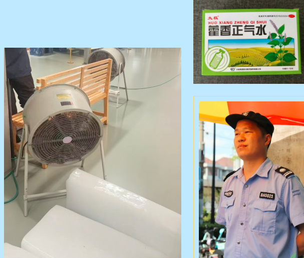 藿香正气水、风油精、清凉油等防暑药品被打包成“清凉小礼包”,分发到各个岗位;车间里放置冰块、门卫处搭建凉棚等降温装置,让热浪无处遁形。